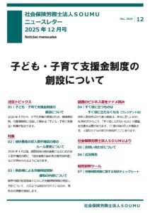 子ども・子育て支援金制度の創設について(社会保険労務士法人SOUMUニュースレター2025年12月号) 公開済み: 2025年12月23日更新: 2025年12月23日作成者: soumura_roumuカテゴリー: ニュースレター 2025年12月度のニュースレターになります。 今月号は、子ども・子育て支援金制度の創設についての特集をしています。 こちらの特集の他、顧問先の皆様には完全版でお届けをさせていただいております。 関連記事 職場トラブルの相談を受けた時に社労士が大切にしていること(社会保険労務士法人SOUMUニュースレター2025年11月号) 2025年11月度のニュースレターになります。 今月号は、職場トラブルの相談を受けた時に社労士が大切にしていることについての特集をしています。 こちらの特集の他、顧問先の皆様には完全版でお届けをさせていただいております。 公開済み: 2025年11月21日更新: 2025年11月21日作成者: soumura_roumuカテゴリー: ニュースレター 「脱・長時間労働体質」の実践マニュアル(社会保険労務士法人SOUMUニュースレター2022年6月号) 2022年6月度のニュースレターになります。 今月号は、「脱・長時間労働体質」の実践マニュアルについての特集をしています。 こちらの特集の他、顧問先の皆様には完全版でお届けをさせていただいております。 公開済み: 2022年6月8日更新: 2022年7月8日作成者: soumura_roumuカテゴリー: ニュースレター 災害対策としてのBCP(社会保険労務士法人SOUMUニュースレター2024年2月号) 2024年2月度のニュースレターになります。 今月号は、災害対策としてのBCPについての特集をしています。 こちらの特集の他、顧問先の皆様には完全版でお届けをさせていただいております。 公開済み: 2024年2月7日更新: 2024年2月25日作成者: soumura_roumuカテゴリー: ニュースレター この投稿へのトラックバック トラックバックはありません。 トラックバック URL